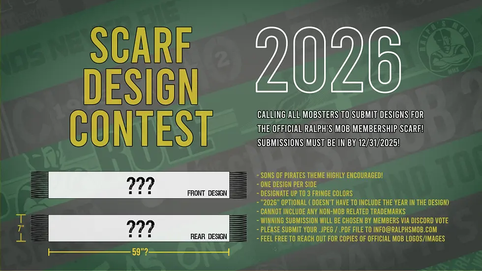 A few things to note: Sons of Pirates theme is highly encouraged this year; the year is also optional; it cannot include any non-Mob related trademarks (remember: you are making a scarf for Ralph's Mob, not the Tampa Bay Rowdies).